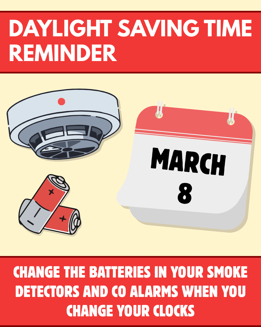 Daylight Saving Time begins Sunday, March 8. Clocks are scheduled to jump ahead approximately one hour. Properly installed, functioning, and maintained smoke and carbon monoxide alarms/detectors play an important role in emergencies. Residents are reminded to check their smoke and CO alarms ahead of daylight saving time to ensure they are functioning properly. The National…